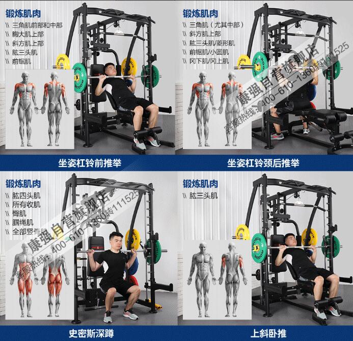 康強BK3010史密斯機史密斯機是一個可以用來做深蹲、舉重、高低拉、蝴蝶擴胸、小飛鳥、手臂彎舉、引體向上等動作的器械,它左右兩邊的軌道固定住杠桿的移動方向,限制了很多動作的運動軌跡,所以對動作的標準性和平衡性的要求相對自由重量訓練降低了不少,也提高了練習的安全系數,非常適合新手,可以說史密斯架是一臺綜合性健身器材。